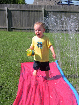 I think these things were called "wet bananas" when I was a kid. Atleast, the one we had was; it was really long and yellow. Braylon wasn't exactly sure how it worked. He ran across it first with his snack in hand, but soon figured out that this didn't work for a number of reasons. For one, his snack got soggy and who likes soggy gold fish? Secondly, you can slip and fall on your bottom while running across slippery surfaces. Finally, it's much more fun when Daddy throws you down the slide and you go really, really fast!!
